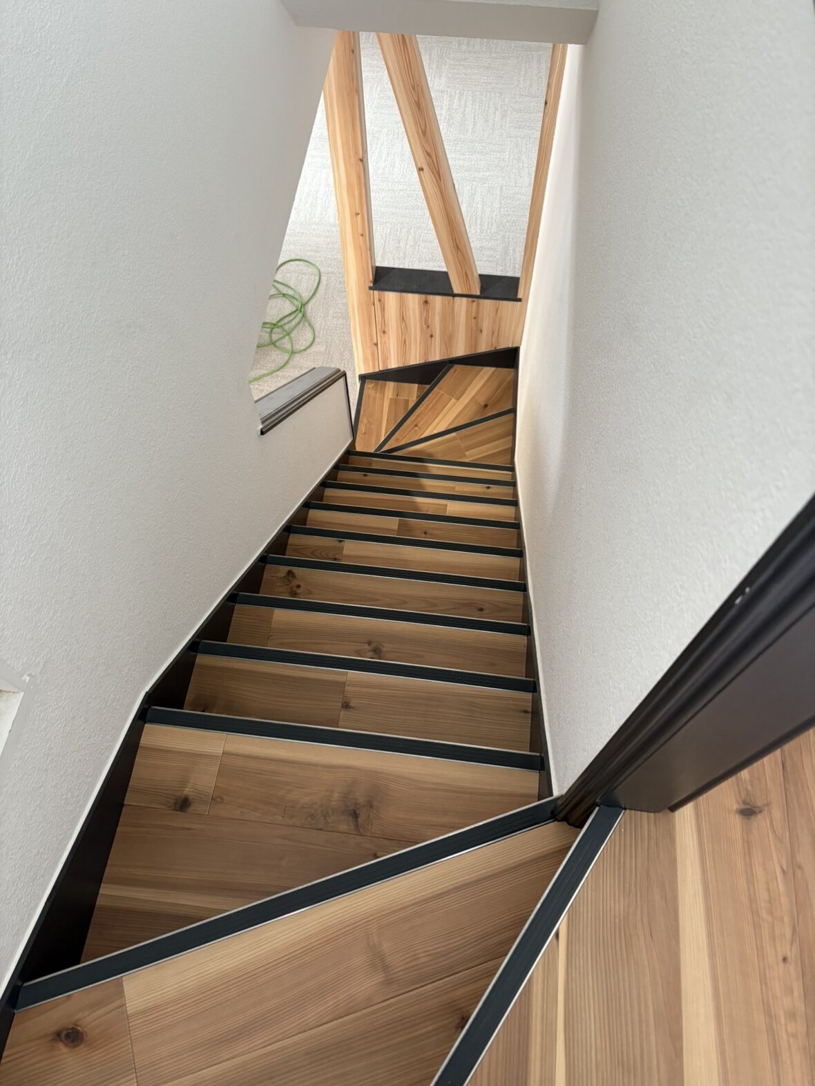 ステンレス製の大きなガラス扉の玄関に始まり、玄関風除室の杉板貼りや笠木・階段部分の塗装、大型の造作収納棚、等々