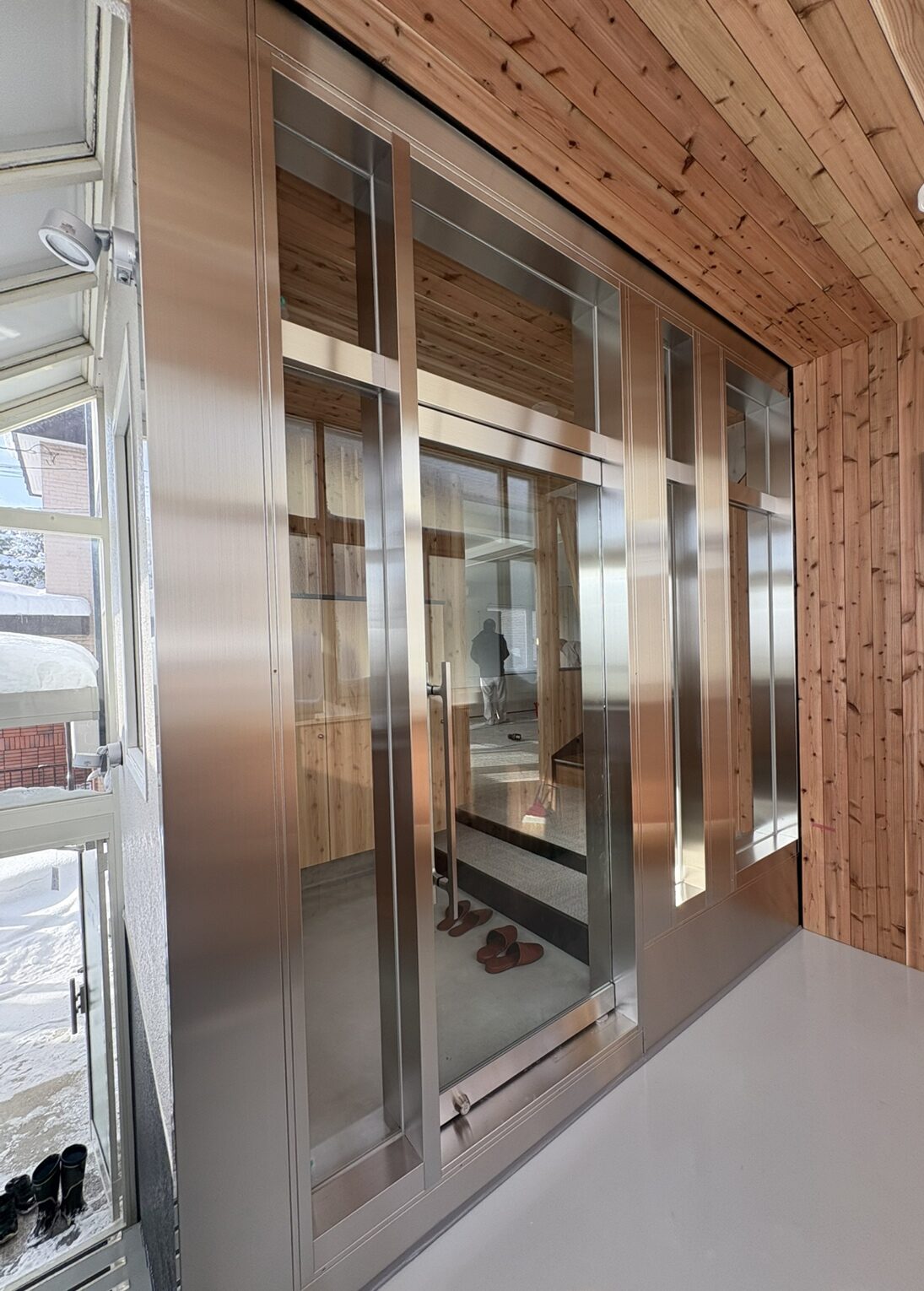 ●ガラス扉の玄関と杉板貼り